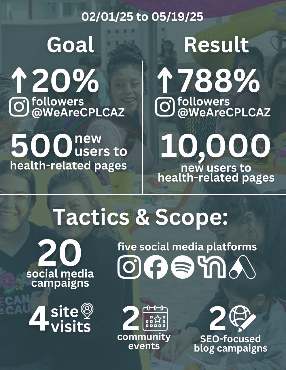 In Spring 2025, as part of the Cronkite Agency, I served as one of the Digital Marketing Specialists for Chicanos por la Causa (CPLC) with funding by the Robert Wood Johnson Foundation (RWJF). Our team set out to support RWJF’s mission to improve health equity for parents and children by elevating CPLC’s digital presence.